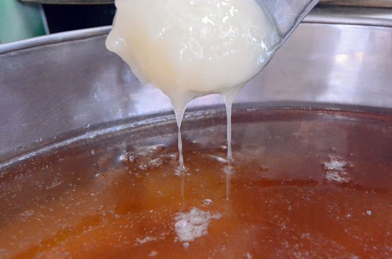 固態的糖約煮90分後成液態,再冷卻成固態,經由90天以上的發酵又成液態,使之凝固需一年以上的時間。