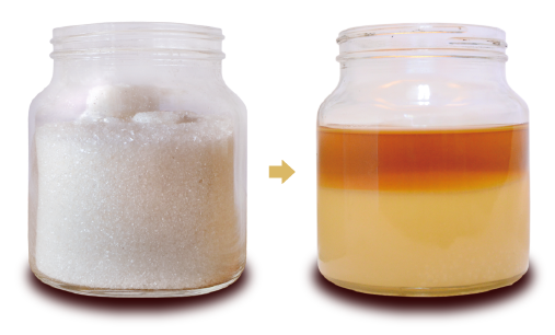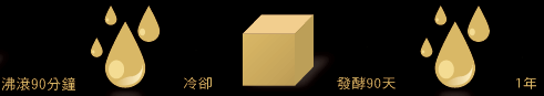 固態的糖約煮90分後成液態,再冷卻成固態,經由90天以上的發酵又成液態,使之凝固需一年以上的時間。